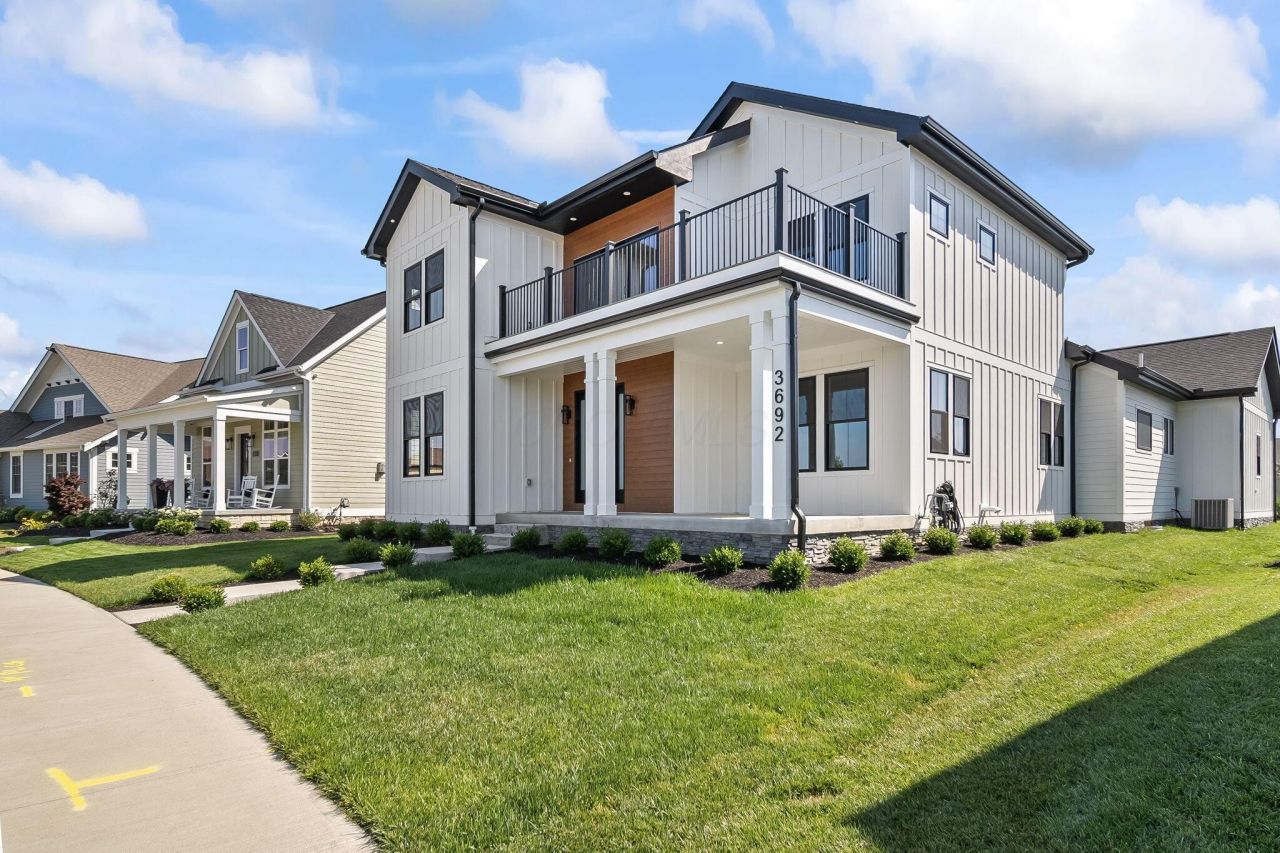 Welcome to your dream home, a stunning modern farmhouse in the heart of the coveted Paddock at Beulah Park. This newly built, move-in ready home offers over 3,273 square feet of luxury living with room to grow thanks to a full unfinished basement already roughed-in for plumbing. Designed for both elegance and comfort, the home features soaring 10-foot ceilings on the first floor and 9-foot ceilings upstairs, enhancing the sense of space and light throughout. Enjoy bold curb appeal with Hardie plank siding, warm wood accents, a large covered front porch, and a second-story balcony offering beautiful sunset views over the 32-acre green space and community pond. Inside, you'll find 5 spacious bedrooms, and 3.5 baths. The first-floor owner's suite boasts a spa-like bath with soaking tub, walk-in shower, and dual vanities. Custom closets with solid wood shelving are found throughout.The open-concept kitchen, dining, and living areas are perfect for entertaining, with quartz countertops, Samsung & Z-Line appliances, a 36'' gas range, and a second ''messy'' kitchen with sink, storage, and custom shelving. Additional features include luxury ceramic & vinyl floors, custom stair handrails & carpentry work, decorative accent walls, and an oversized finished garage.Upstairs offers a versatile loft space, three additional bedrooms, and access to a show-stopping balcony. The large covered side patio extends your living space outdoors. Natural light fills every room through expansive windows.Living in Beulah Park means you are at walking distance to Downtown Grove City, access to top-tier amenities--pickleball courts, biking and walking paths, a picturesque pond, and the West Pavilion for community events. This is more than a home; it's a lifestyle. Don't miss your chance to own one of the finest homes in this vibrant community.